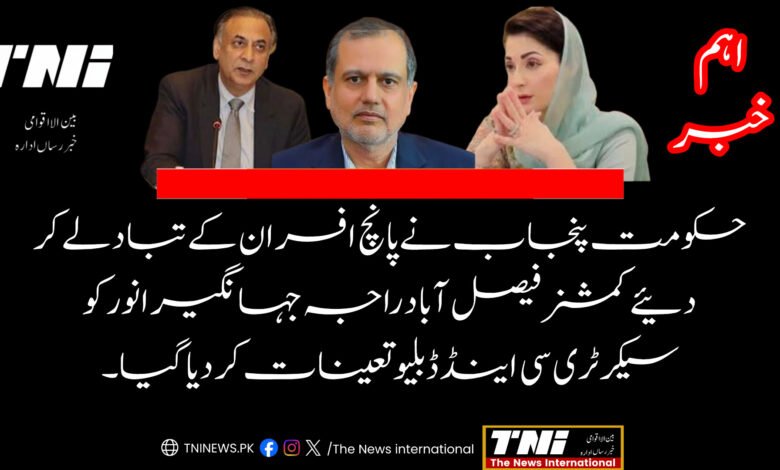 لاہور(ٹی این آئی)حکومت پنجاب نے پانچ افسران کے تبادلے کر دئے،کمشنر فیصل آباد راجہ جہانگیر انور کو سیکرٹری سی اینڈ ڈبلیوپنجاب تعینات کر دیا گیا،