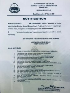 یاد رہے کہ امیر تیمور  حال ہی جنوری میں ریٹائر ہوئے انھیں تمام قواعد و ضوابط کو پس پشت ڈالتے ہوئے3 سال  کنٹریکیٹ پر جنوبی پنجاب میں ڈائریکٹر سپیشل برانچ 5لاکھ روپے کی تنخواہ پر لگا دیا ہے